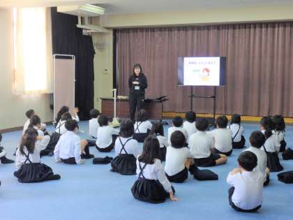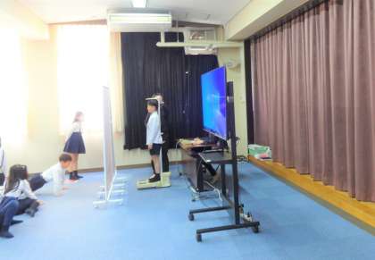 養護教諭の先生からお話を聞いたあと、1人ずつ身長体重を図っていました。