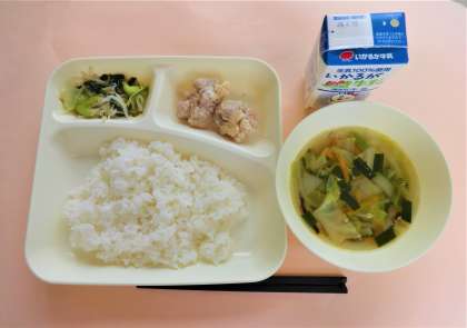 ご飯・牛乳・鶏肉のからあげ・中華スープ・チンゲンサイともやしの甘酢あえ