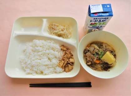 ご飯・牛乳・みそ肉じゃが・もやしの甘酢あえ・ごまかかいため