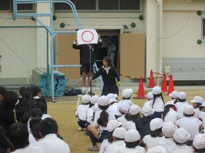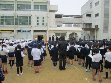 本日、運動場で児童集会が開かれました。いつもは講堂で行うのですが、講堂が天井の工事のため、平成28年1月8日まで使用できません。いつものように歌やクイズをみんなで楽しみました。これから寒くなりますが、毎週元気に外でがんばりましょう!