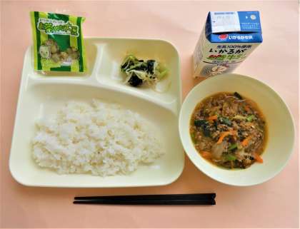ご飯・牛乳・マーボーはるさめ・もやしとチンゲンサイの甘酢あえ・まっ茶だいず