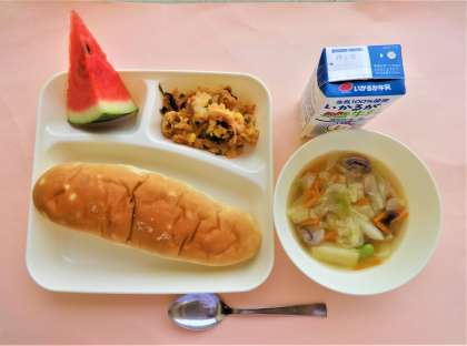 おさつパン・牛乳・チキンパエリア・ウインナーとキャベツのスープ・すいか