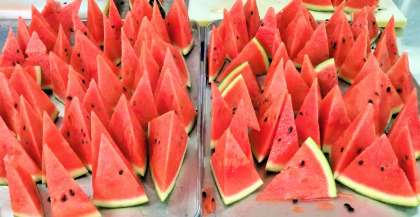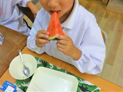 給食室では、すいかの一番甘い部分がみんなにあたるように、切り方を工夫しています。