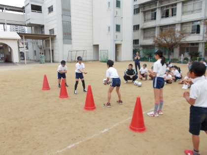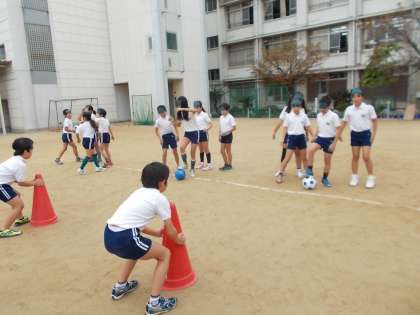 アイマスクをつけた体験では、まっすぐ走ることから始め、コーンにボールを当てることそして最後は、手を使ってボールを落とさないようにパスするといったことを行いました。この体験でとても重要になったのが、アイマスクをつけていない周りの友達のサポートでした。はじめは、自分から見て「右」と言っていた声が、いつの間か相手から見た「左」に変わっていったり、「あとちょっと」が「あと5歩」となったりと相手の立場になった声かけができるようになりました。