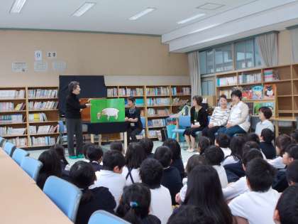 「はらぺこあおむし」で有名なエリック・カールの「月ようびは なにたべる?」、やなせたかしの「チリンのすず」を読み聞かせしていただいたり、「じごくのそうべい」の紙芝居をしていただいたり、いろいろな本を紹介していただいたりしました。