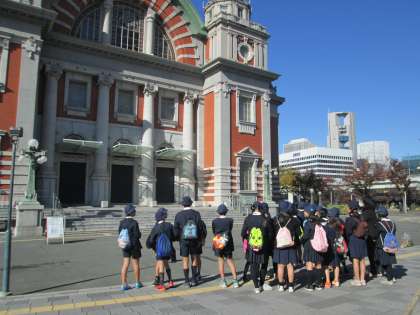 11月27日(金)6年生が社会見学に行ってきました。学校⇒四天王寺⇒秀吉時代の石垣⇒中央公会堂⇒適塾⇒難波宮跡⇒歴史博物館を廻るコースです。(※写真もこの順番で掲載してあります)事前に自分たちで観に行きたい場所を決めて、下調べをして当日を迎えました。1組、2組関係なく、A.B.Cの3コースに分かれて、廻る順番を変えて、難波宮で待ち合わせをする手順で実施しました。当日は寒かったですが、天候にも恵まれ、楽しい社会見学となりました。スマホによると、10,000歩以上歩いたようで、なかなか健康的な社会見学となりました。みなさんお疲れさまでした。