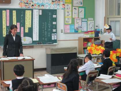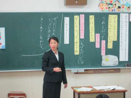 昨日、1年生の研究授業(国語)が行われました。教材は「おとうとねずみチロ」です。あらすじは、子ねずみが3匹で暮らしている家に、おばあちゃんから「赤と青のチョッキを編んで送ります。」という手紙が届きます。喜んだのも束の間、お兄ちゃん・お姉ちゃんに、「赤と青のチョッキだから、チロのはないよ」と言われ、心配するおとうとねずみ。字が書けないため、手紙を出す事もできず、「ぼくにもチョッキあんでね!」と、おばあちゃんにメッセージを送ります。後日、お兄さん、お姉さんには青と赤のチョッキ、チロには「赤と青のしましまのチョッキ」が届くという、心あたたまるお話しです。具体物を使った楽しい授業に、グイグイ子どもたちも引き込まれていきました。チロのお面をつけてチロになりきって、いろいろ発表してくれた1年2組のみなさん、お疲れさまでした。