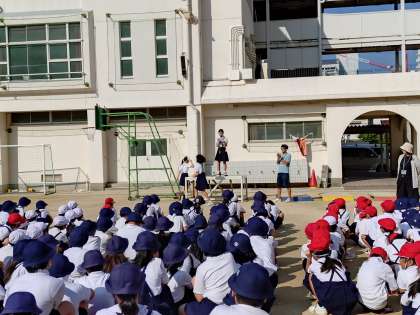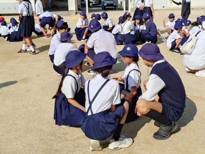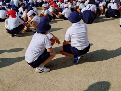 月曜日の児童集会では「猛獣狩りに行こうよ」ゲームをしました。集会委員会が言った動物の名前の文字数と同じ人数の友だちとグループになり、その場にしゃがみます。