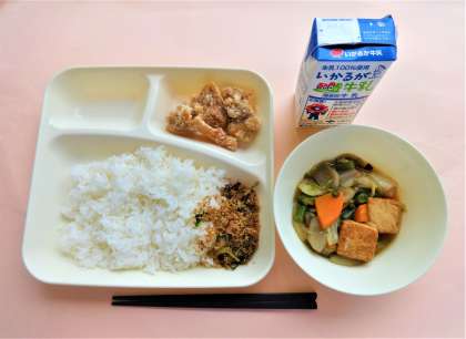 ご飯・牛乳・鶏肉のたつたあげ・あつあげと野菜の煮もの・おかかなっ葉
