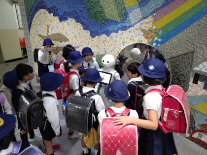 玄関ホールでは、しばらくお休みをしていたペッパー君(マシュマロ君)に「おはよう!」とあいさつする児童の姿が見られました。