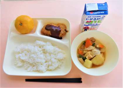 ご飯・牛乳・みそカツ・鶏肉とじゃがいもの煮もの・みかん