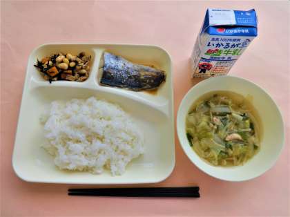 ご飯・牛乳・さごしのごまじょうゆかけ・すまし汁・大豆の煮もの