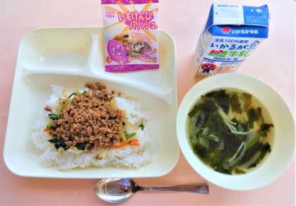 ビビンバ・わかめスープ・いもけんぴフィッシュ・牛乳