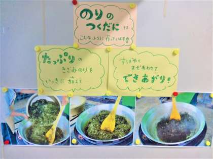 今日は、のりができるまでについて紹介された本とともに、給食室での「のりのつくだ煮」の調理の様子の写真を掲示しました。