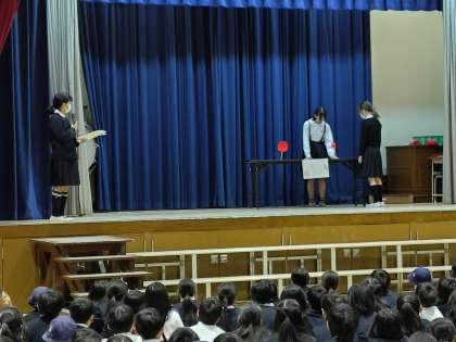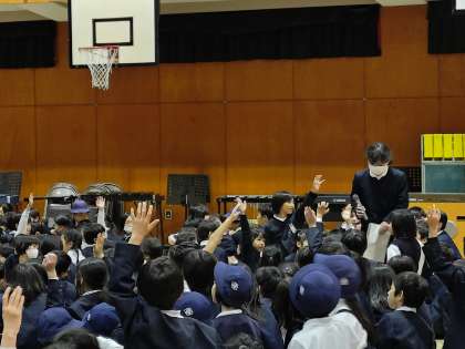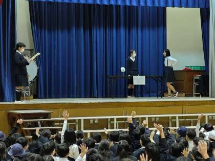 今日の児童集会で「にんげんまちがい探し」をしました。最初の登場と2回目の登場では集会委員の恰好や動き、持っている物に何か「ちがい」があります。さりげなく、しかしわかりやすい「ちがい」なので、低学年から高学年まで、たくさんの児童の手が挙がっていました。
