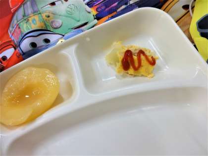 今日のオムレツには、ツナとじゃがいもが入り、自分でケチャップをかけて食べました。