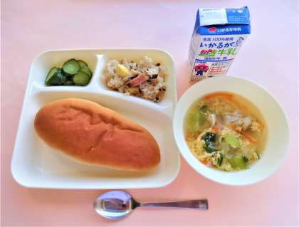 黒糖パン・牛乳・中華おこわ・卵スープ・きゅうりのピリ辛あえ