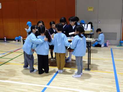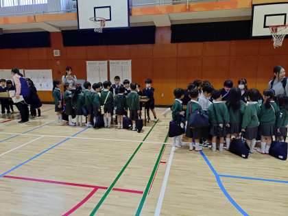 1年生はこれまで生活科の学習で、どんぐりやまつぼっくりなどの秋の木の実を使って、おもちゃ作りをしてきました。今日は、近隣の保育園の子どもたちを招待しての「あきのおもちゃパーティ」が開かれました。