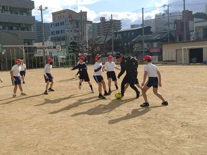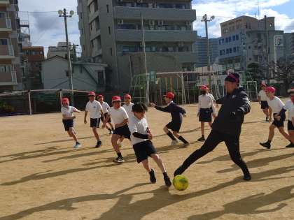 5年生の子どもたちも、自分たちで判断してパスが通らないようにコーチをマークをする等、考えながらプレーをしていました。子どもたちチームが得点を入れた時は大きな歓声が沸き起こりました。