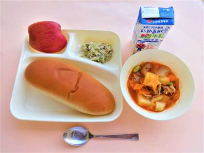 黒糖パン・牛乳・ケチャップ煮・ささみと野菜のソテー・りんご