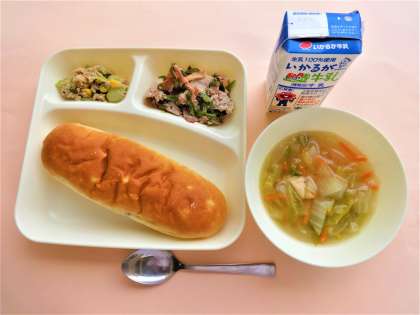 おさつパン・牛乳・豚肉のオイスターソース焼き・中華スープ・ツナとチンゲンサイのいためもの