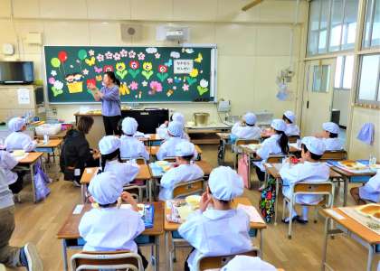 早速おかわりに並ぶ児童もいて、楽しくておいしい給食の時間になりました。