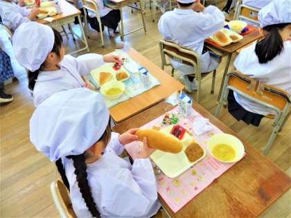 パンは一口サイズにちぎってジャムを付けて食べること、ストローのさし方、袋の開け方などを担任の先生に教えてもらいながら、味わって食べていました。