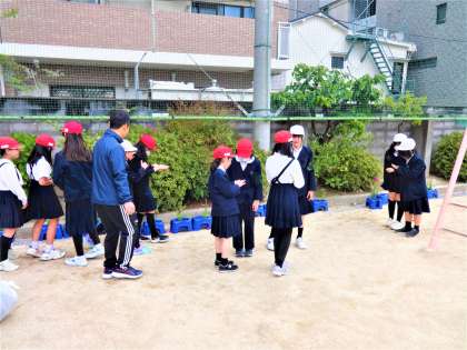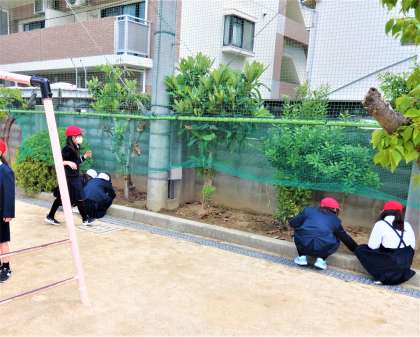 運動場には、普段意識していない植物があることにも気づき、みかんの木には今ちょうど実がなっているという発見や、学習園からはダンゴムシ、カメムシを見つけて報告してくれました。