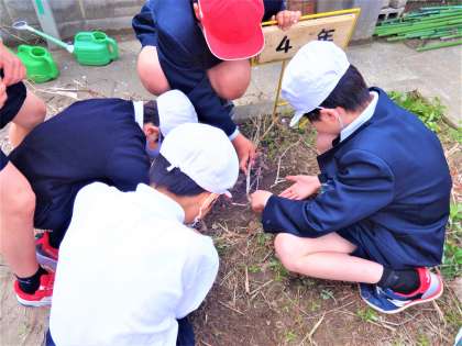 4年生は理科の授業で、運動場に出て「春みつけ」をしていました。