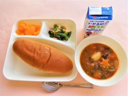 今日の給食は、小麦粉を使わずに水溶き上新粉でとろみをつけたビーフシチューでした。