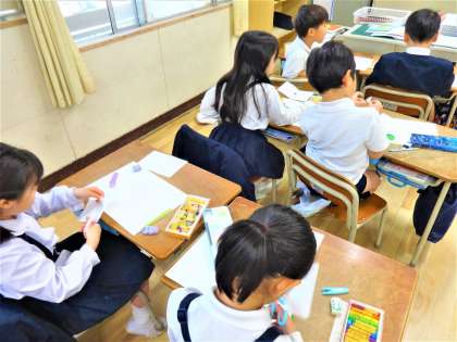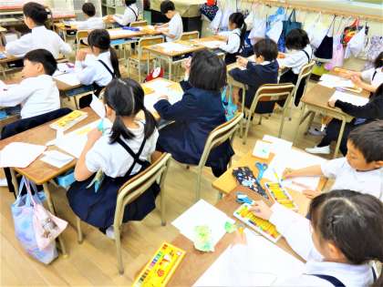 2年生は、図工でクレヨン、パスを使い、上手にぼかしができるように工夫しながら取り組んでいました。