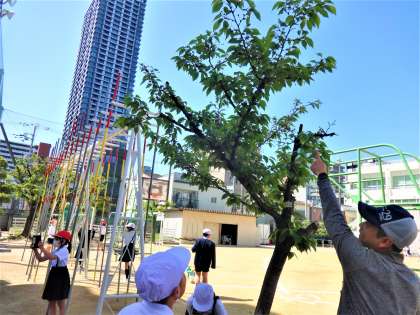 春の陽光の中、4年生は運動場で春の生き物観察をしていました。