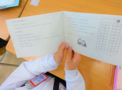 今日は、遠足のしおりが配られ、めあてや並び方、持ち物などについて説明してもらい、みんなで確認していました。