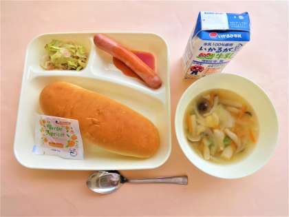 コッペパン・アプリコットジャム・牛乳・ウインナーのケチャップソース・スープ・焼きツナキャベツ