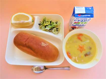黒糖パン・牛乳・鶏肉とコーンのシチュー・キャベツのひじきドレッシング・かわちばんかん