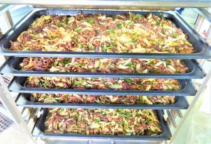 プルコギは、牛肉にすりおろしたにんにくやしょうが汁、コチジャン、すりごまなどで下味をつけ、たまねぎ、にらを混ぜ合わせて焼きました。