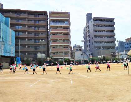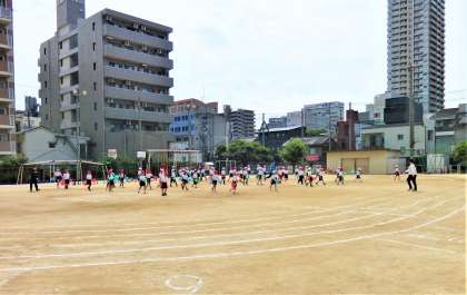 1年生は運動場で、立ち位置の確認や全体を通しての練習をしていました。