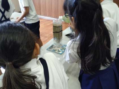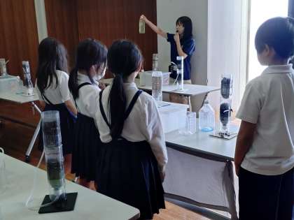 浄水処理の参加型実験では、浄水処理工程の一部(砂・粒状活性炭ろ過)について、ミニチュア模型で実際に体験しました。濁っていた淀川の水が、ろ過をすることで透明になり、匂いもなくなる様子を体験することができました。