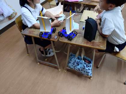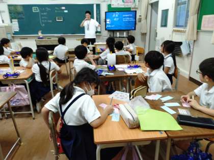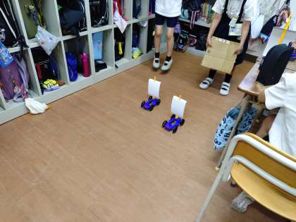 3年生は理科で「風とゴムの力のはたらき」の学習をしています。風の力で動く車を使い、いろいろと試す中で、気がついたことや疑問に思ったことをたくさんメモしていました。自分たちで課題を見つけ、主体的に解決していくために熱心に取り組んでいました。