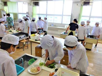 どの班も手際よく青菜をいため、強火でサッと仕上げ、味付けもばっちりでした。