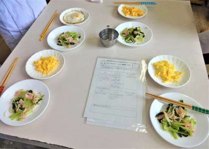 6年生は家庭科で「作ってみよう〜ハム入り野菜いため〜」と「卵料理」の調理実習をしました。