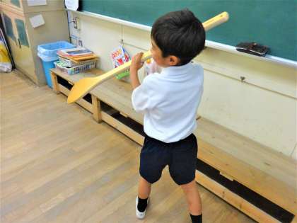 給食調理員さんにゲストティーチャーでも来てもらい、実際に使っているスパテラを使って給食調理員さんの体験をさせてもらいました。