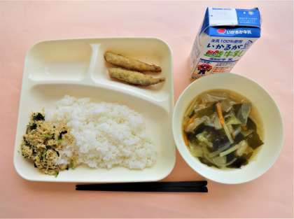 今日の献立は、ご飯・牛乳・いわしてんぷら・五目汁・とりなっ葉いためでした。