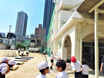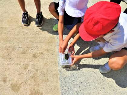 羽化したアゲハ蝶を大切に運動場まで運び、「元気でね!」の声をかけて、青空に羽ばたいていくのをみんなで見送っていました。