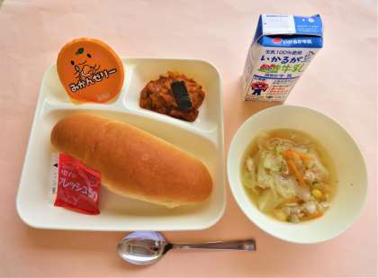 コッペパン・いちごジャム・牛乳・かぼちゃのミートグラタン・スープ・みかんゼリー
