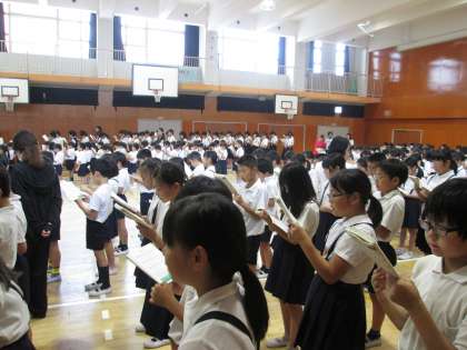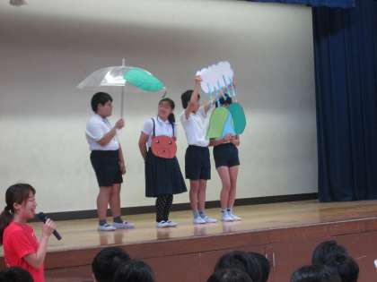 昨日9日は木曜日、児童集会でした。月が替わり6月になり、今月の歌は「あめふりくまのこ」です。歌詞の内容を児童会委員の子たちが前で一生懸命説明してくれました。梅雨の時期ですが、雨を楽しめる豊かな心をみんなで持てるといいですね。