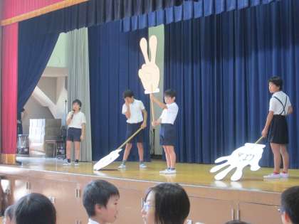 今朝は1学期最後の児童集会でした。朝から行動は暑かったですが、みんな元気に「たなばたさま」を歌い、「王様じゃんけん」ゲームをしました。檀上の児童会委員とじゃんけんをして、だれが最後まで、残っているか競うゲームです。何度かじゃんけんをしましたが、「あれあれ?1年生は負けても、座らずにじゃんけんしています・・・」そんな1年生の姿も上級生たちはあたたかく見守っていました。