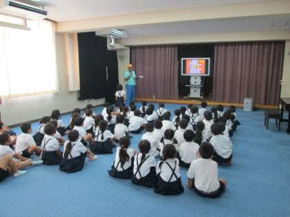 今日は1年生、2年生の低学年を対象に、「あんまち隊」の方が出前授業できていただき、ビデオを使いながら、交通安全や防犯について、楽しい授業をしてくださいました。授業では最後にあんまち隊のマスコット「あんちゃん」が登場して、みんな駆け寄り、大喜びでした。
