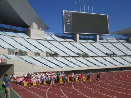 午前は長居スタジアムで100M走、800M走の個人タイムを計測しました。そして午前の最後は学校対抗選抜400Mリレーで盛り上がりました。