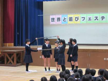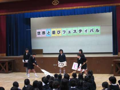 異学年でペアを組んで、世界の遊びを通して、心のふれあいを深め、様々な国に関心を持ち、集団の中での活動を意識していくのが教育目的です。